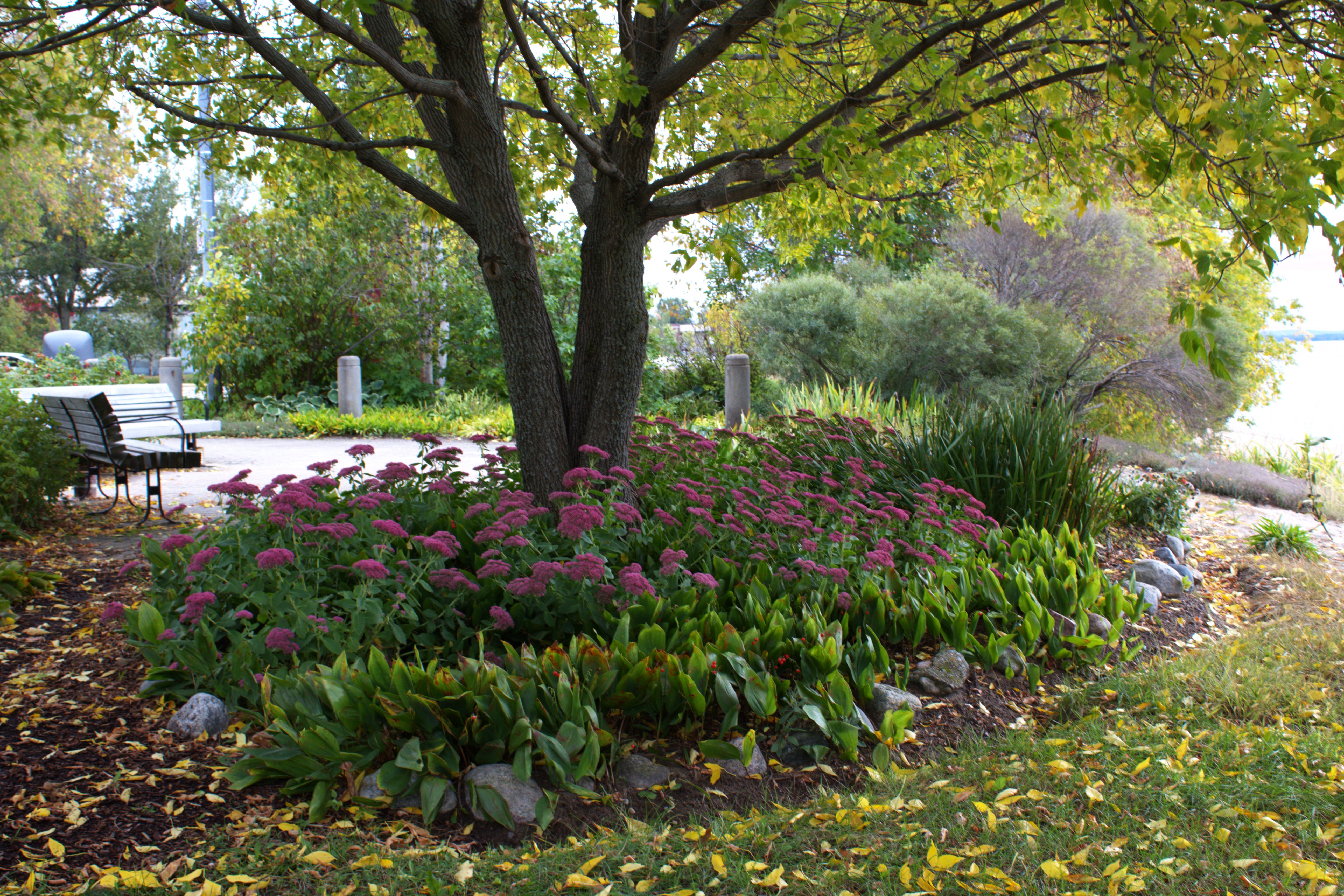 This garden bed experiences a lot of pedestrian traffic as it is located near the boat ramp. This large garden has a burst of colour when in full bloom spring, summer & fall (poppies, daylilies, daisies, coneflowers). The butterflies and bees love it!