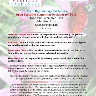 By The Executive Team The North Bay Heritage Gardener’s size has grown exponentially in the last decade or so, with new additions to our office staff and an abundance of new recruits for the Waterfront gardens. While our dutiful office team is constantly striving to coordinate what is going on around the flower beds on … More Executive Positions Available
